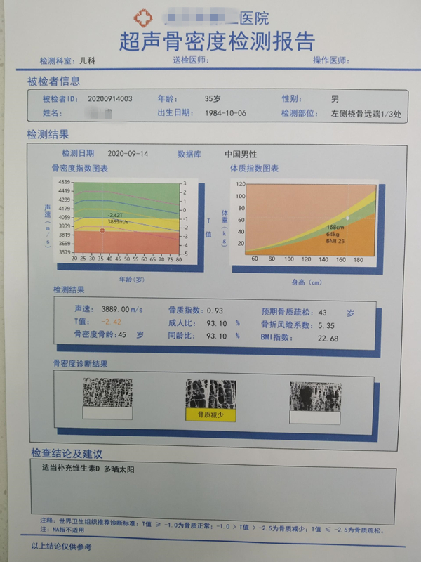 骨密度檢測能有效幫助了解骨質(zhì)狀況,預(yù)防骨質(zhì)疏松的發(fā)生。在臨床使用骨密度值時(shí),由于不同的骨密度檢測儀的絕對值不同,通常使用T值判斷骨密度是否正常。T值是一個(gè)相對值,正常參考值在-1和+1之間。當(dāng)T值低于-2.5時(shí)為不正常,也就是骨質(zhì)疏松。